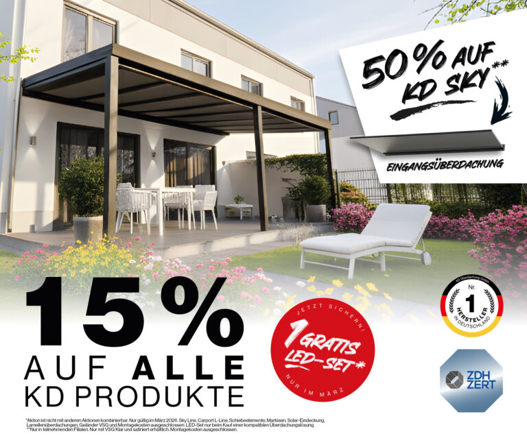 *Aktion ist mit anderen Aktionen nicht kombinierbar. Gültig nur im März 2026. Carport L-Line, Sky Line, Schiebeelemente, Geländer VSG, Markisen, Solar-Eindeckung, Lamellenüberdachung und Montagekosten ausgeschlossen. LED-Set nur beim Kauf einer kompatiblen Überdachungslösung.