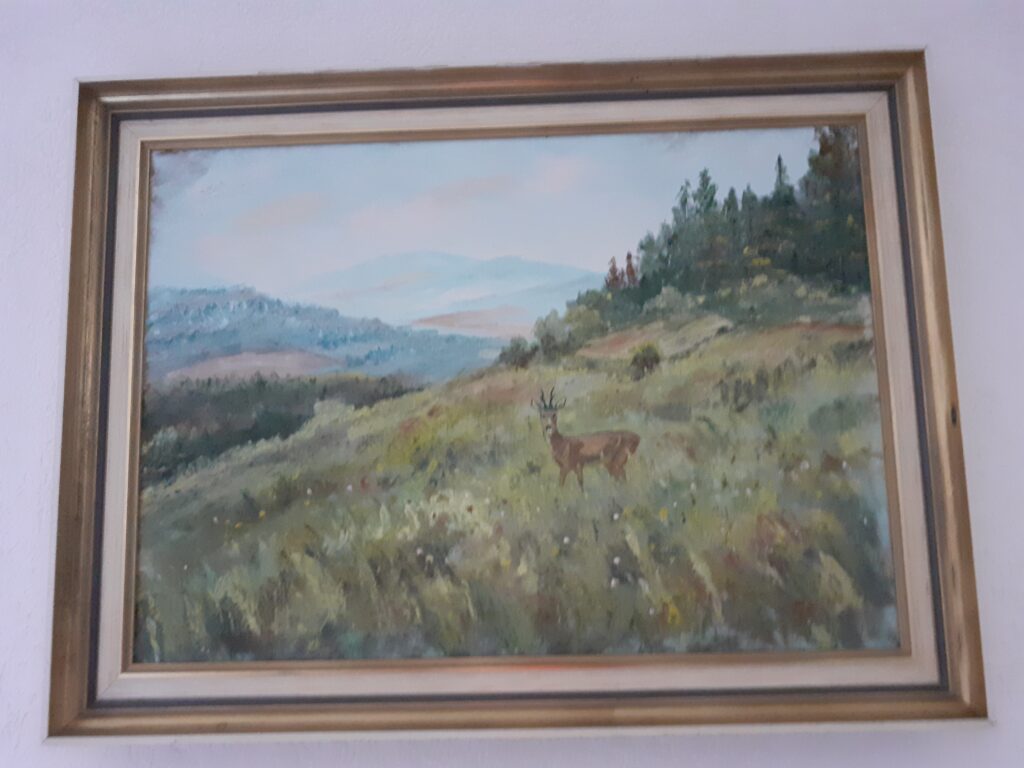 Ölgemälde auf Leinwand, mit Holzrahmen, Landschaftsmotiv mit Reh im Vordergrund, Gr. 80 x 60 cm