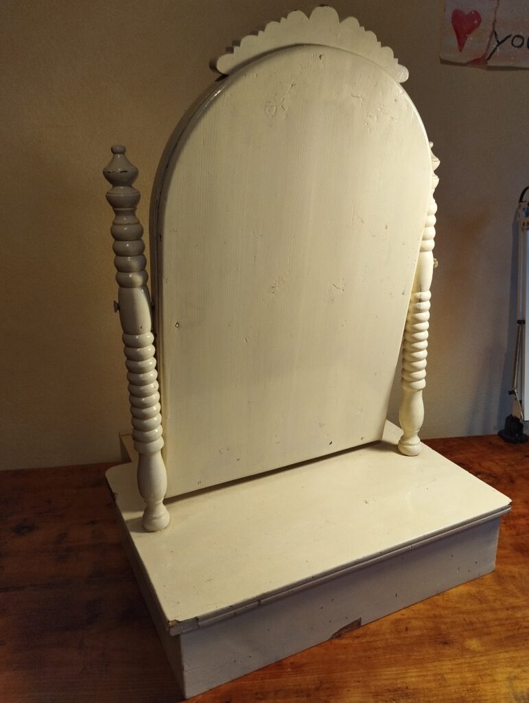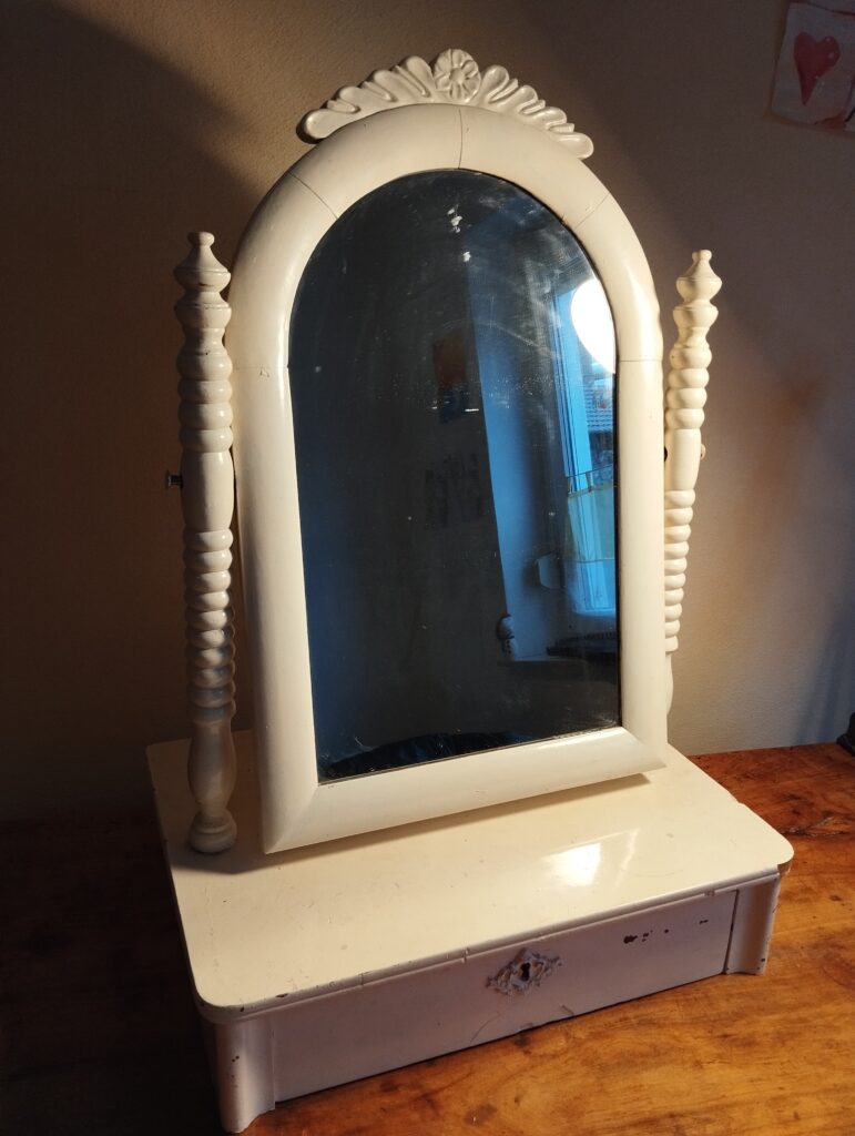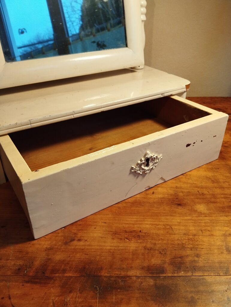 alt, Schublade, Holz, weiß lackiert, Spiegel schwenkbar, 70 x 45 x 34 cm