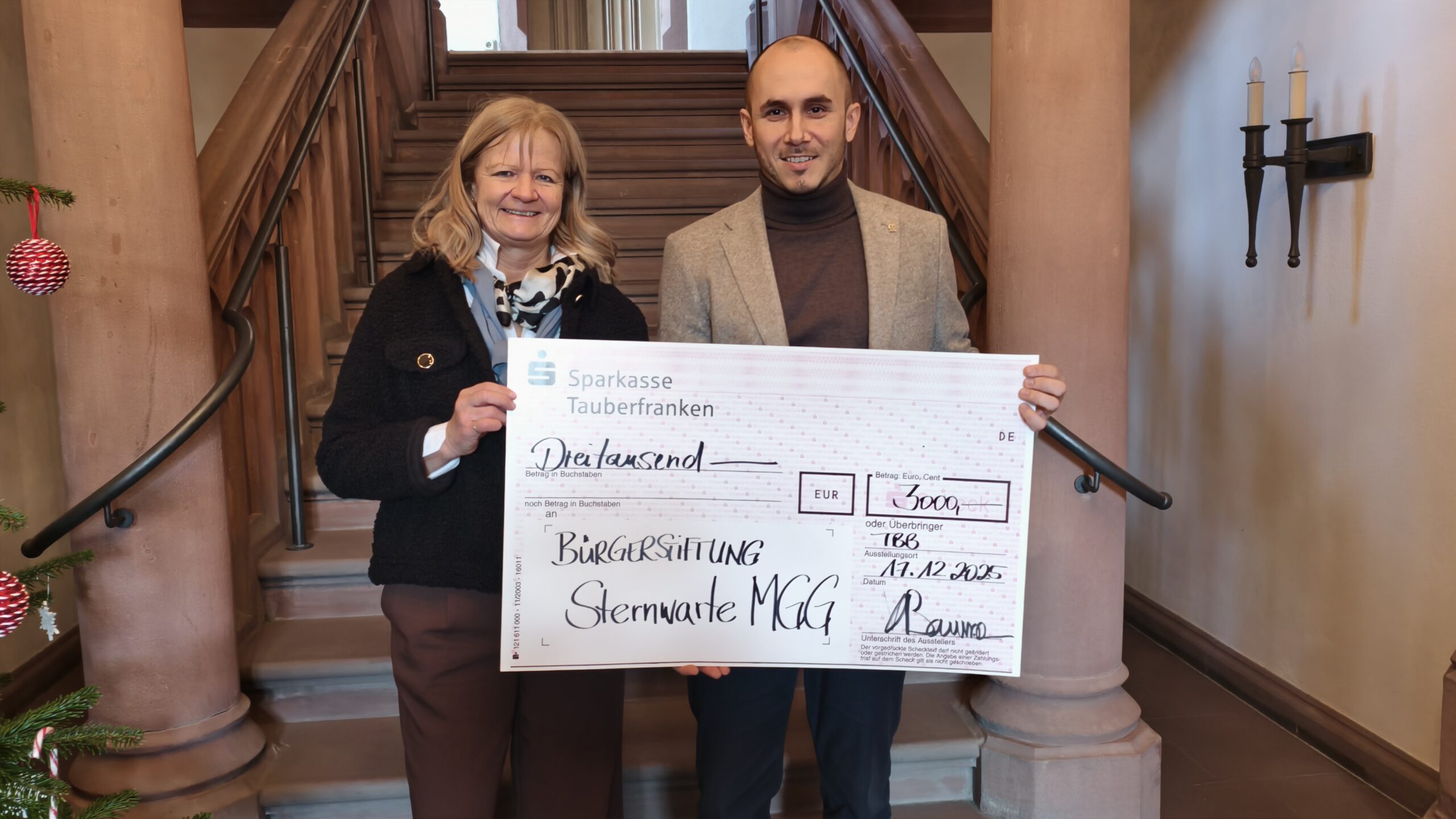 Der Bürgerstiftung Tauberbischofsheim wurde am 17. Dezember eine großzügige Spende in Höhe von 3.000 Euro überreicht. Die Spende wird für den Bau einer Sternwarte am Matthias-Grünewald-Gymnasium verwendet, ein Projekt, das Schülern spannende neue Perspektiven auf die Wissenschaft eröffnen soll. Bürgermeisterin Anette Schmidt nahm den symbolischen Scheck im Rathaus entgegen. Das Projekt soll Schülern neue Perspektiven auf die Welt der Wissenschaft eröffnen.