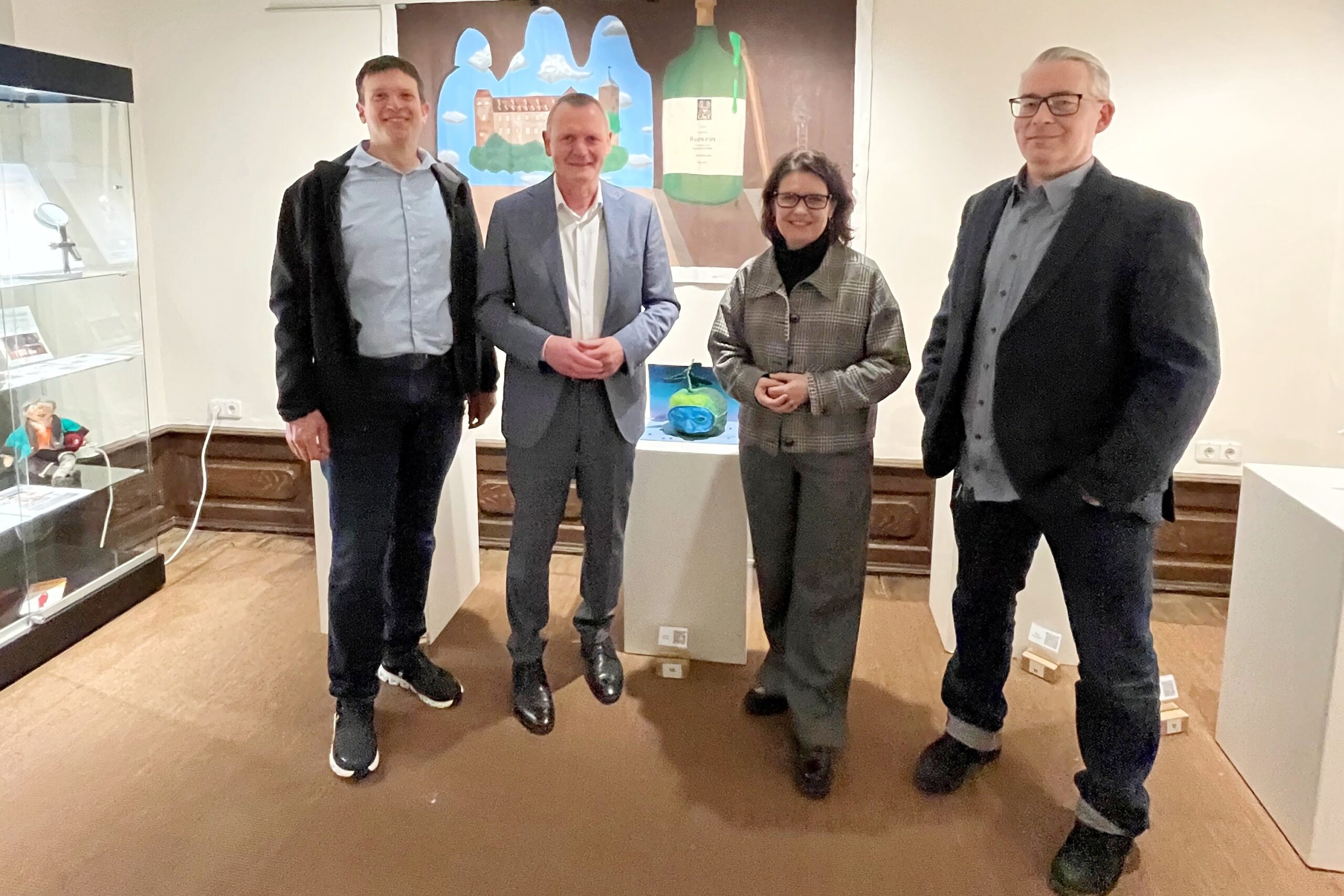 Zum Hintergrund der Ausstellung: Im Unterricht ihres Kunsterziehungslehrer Michael Nembach beschäftigte sich die 11. Klasse des Balthasar-Neumann-Gymnasiums mit dem belgischen Surrealisten René Magritte. Dabei entstanden „Magritte Fakes“ und 3D-Objekte, die typische Magritte-Elemente mit persönlichen Bezügen der Schüler verbinden. Kulturamtsleiterin Inge Albert war so angetan von der Kreativität der Arbeiten, dass sie gemeinsam mit Michael Nembach eine Ausstellung der Werke im Franck-Haus realisierte.